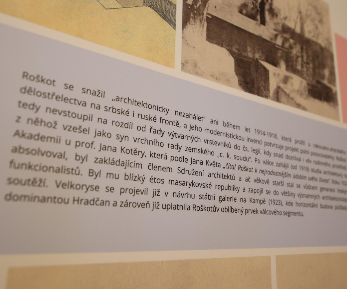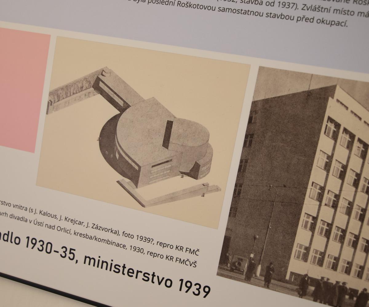 Zvláštní pozornost je věnována i samotnému Roškotovu divadlu v Ústí nad Orlicí (1935–1936), které architekt pojal s výraznou monumentalitou a osobitým výrazem. Výstava zároveň nahlíží i do osobní roviny Roškotova života, mimo jiné do jeho složité rodinné vazby k Emilu Háchovi, tehdejšímu prezidentu protektorátu, který byl bratrancem jeho matky.